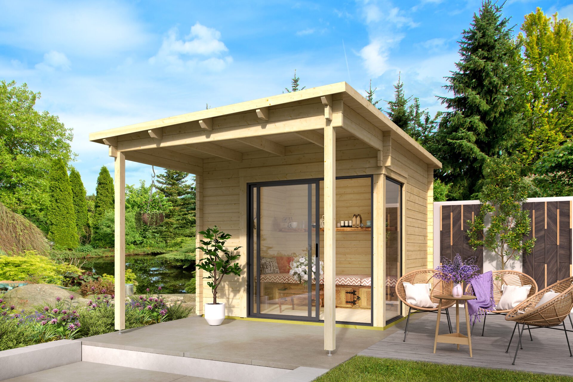 Väike varikatusega suvetuba. Majal on alumiiniumist aken ja lükanduks.