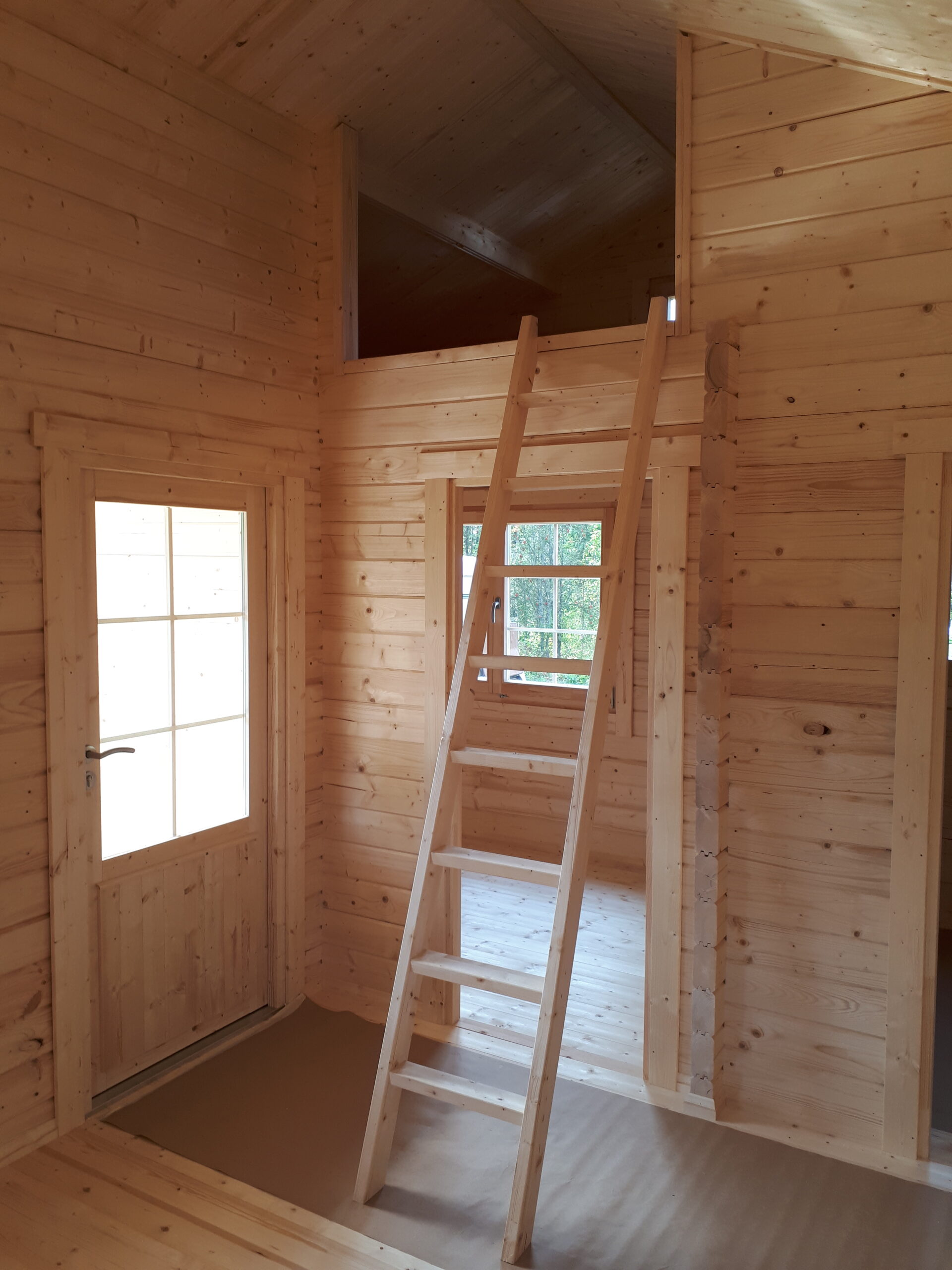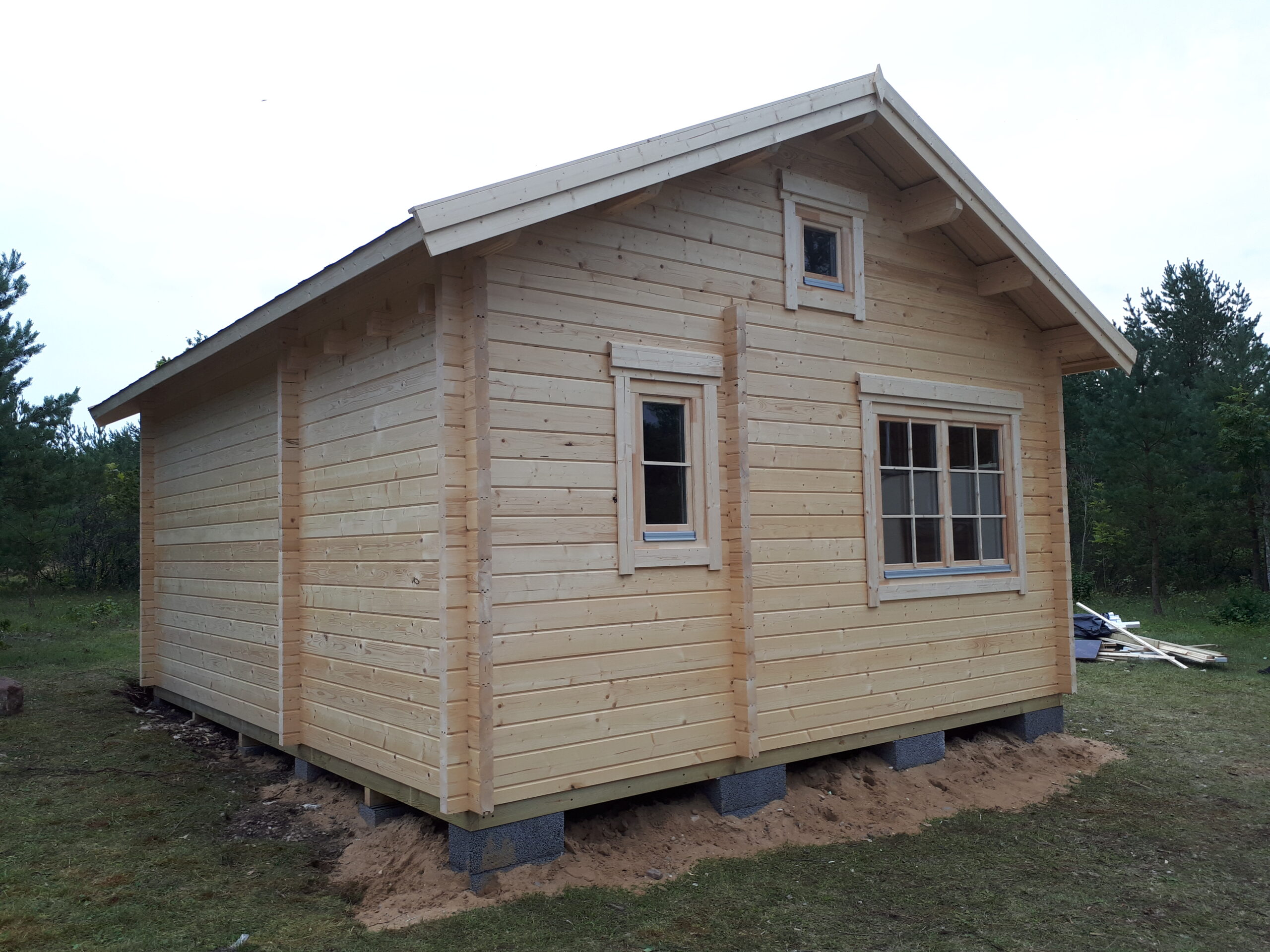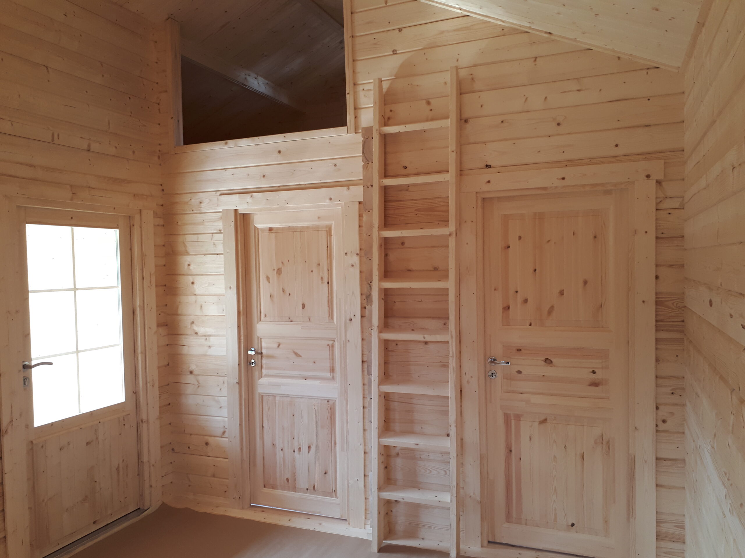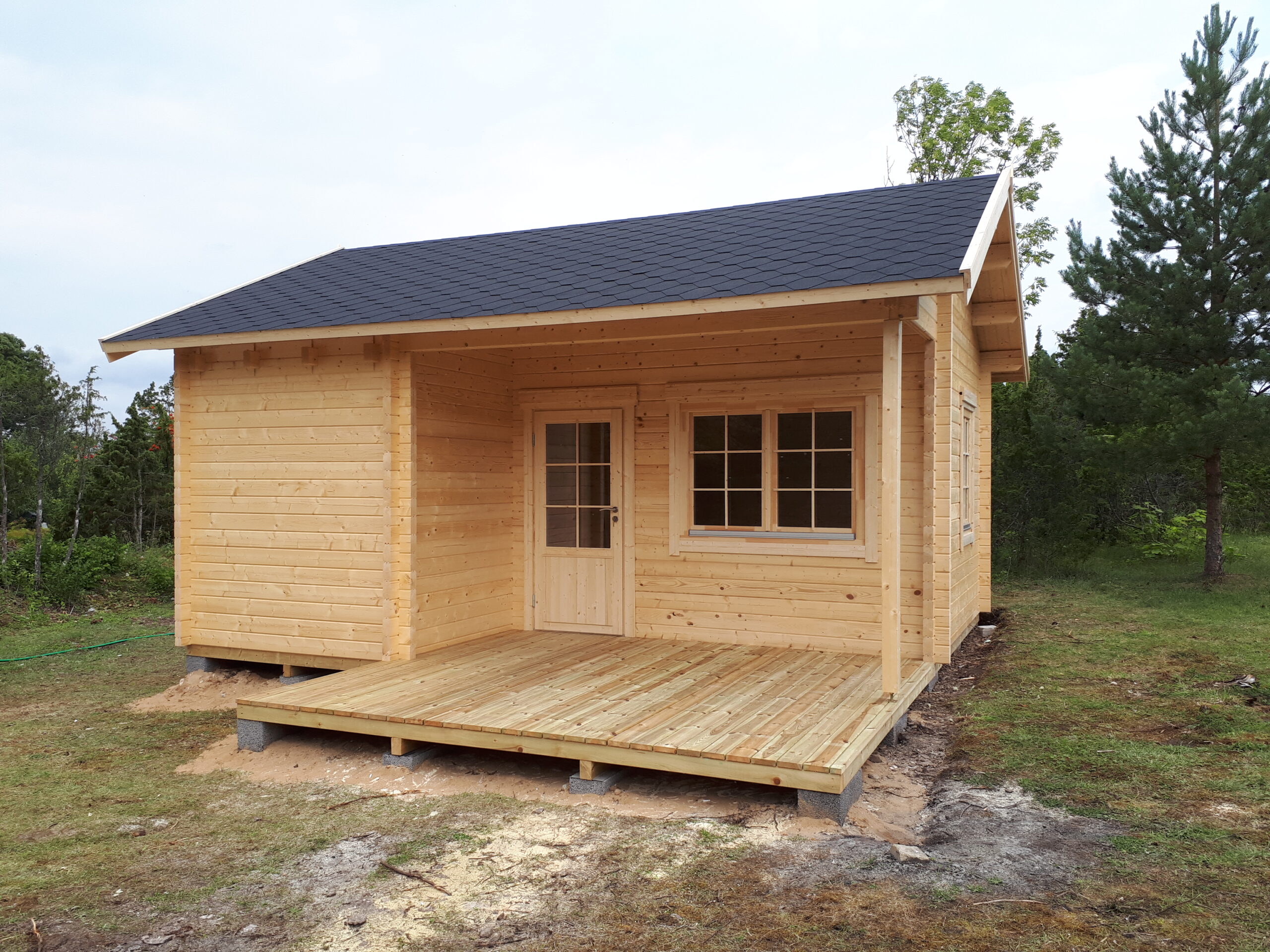Immutatud alusraam, tapitud seinadetailid, põrandalaud, terassilaud, katuselaud, liimpudiust uksi, välisuks roostevabast plekist lävepakuga, aknad, klaaspakett, kinnitusvahendid ja paigaldusjuhend.