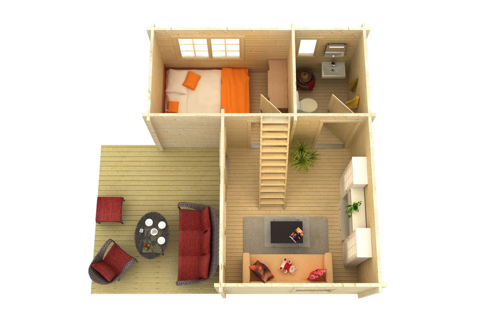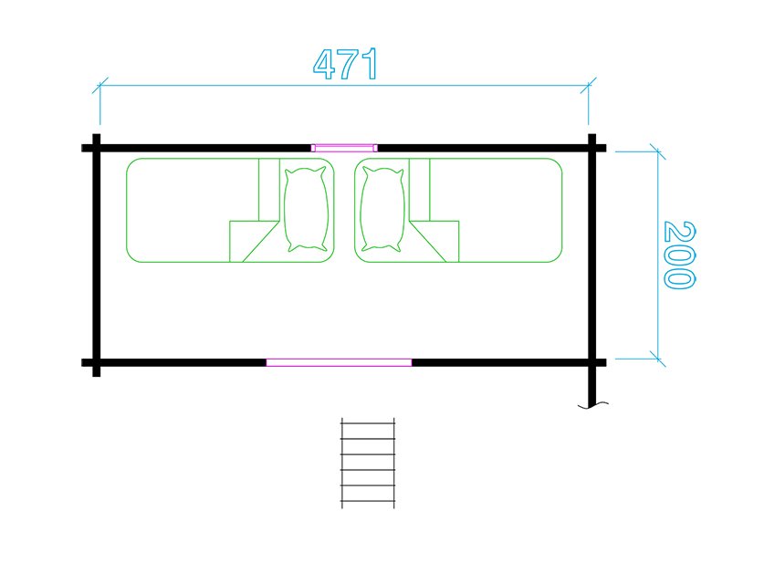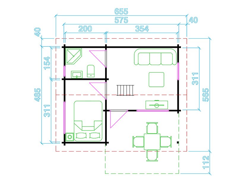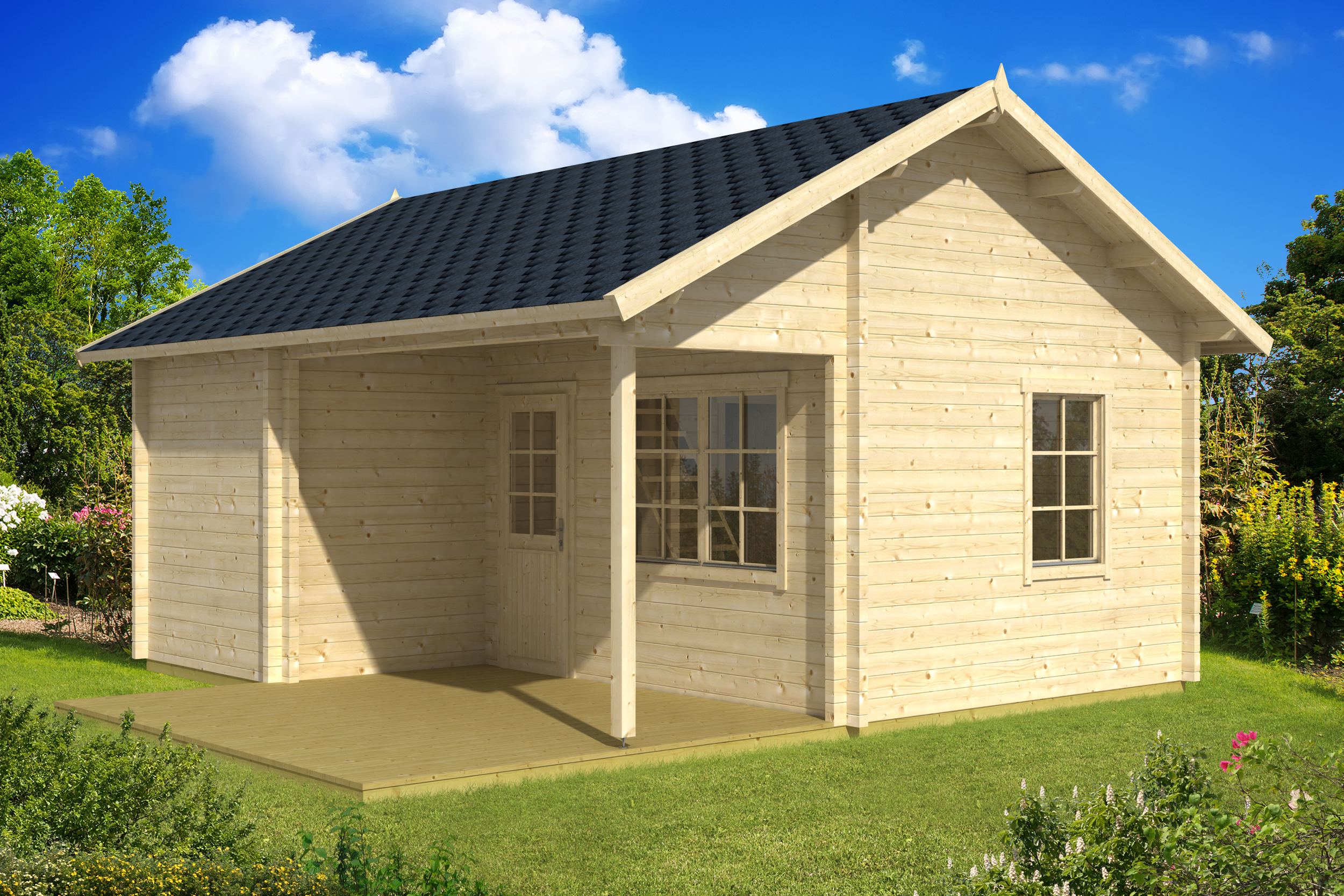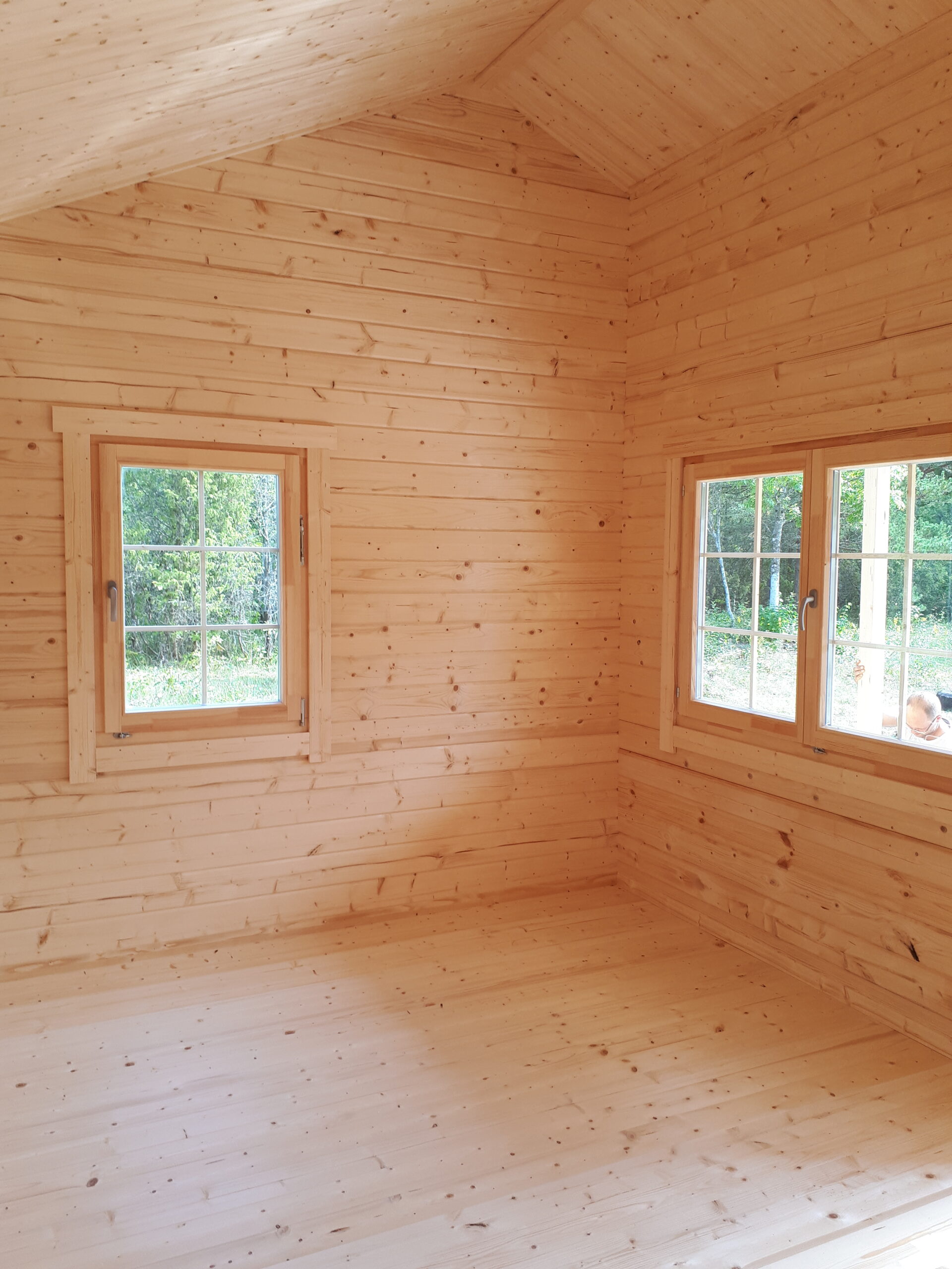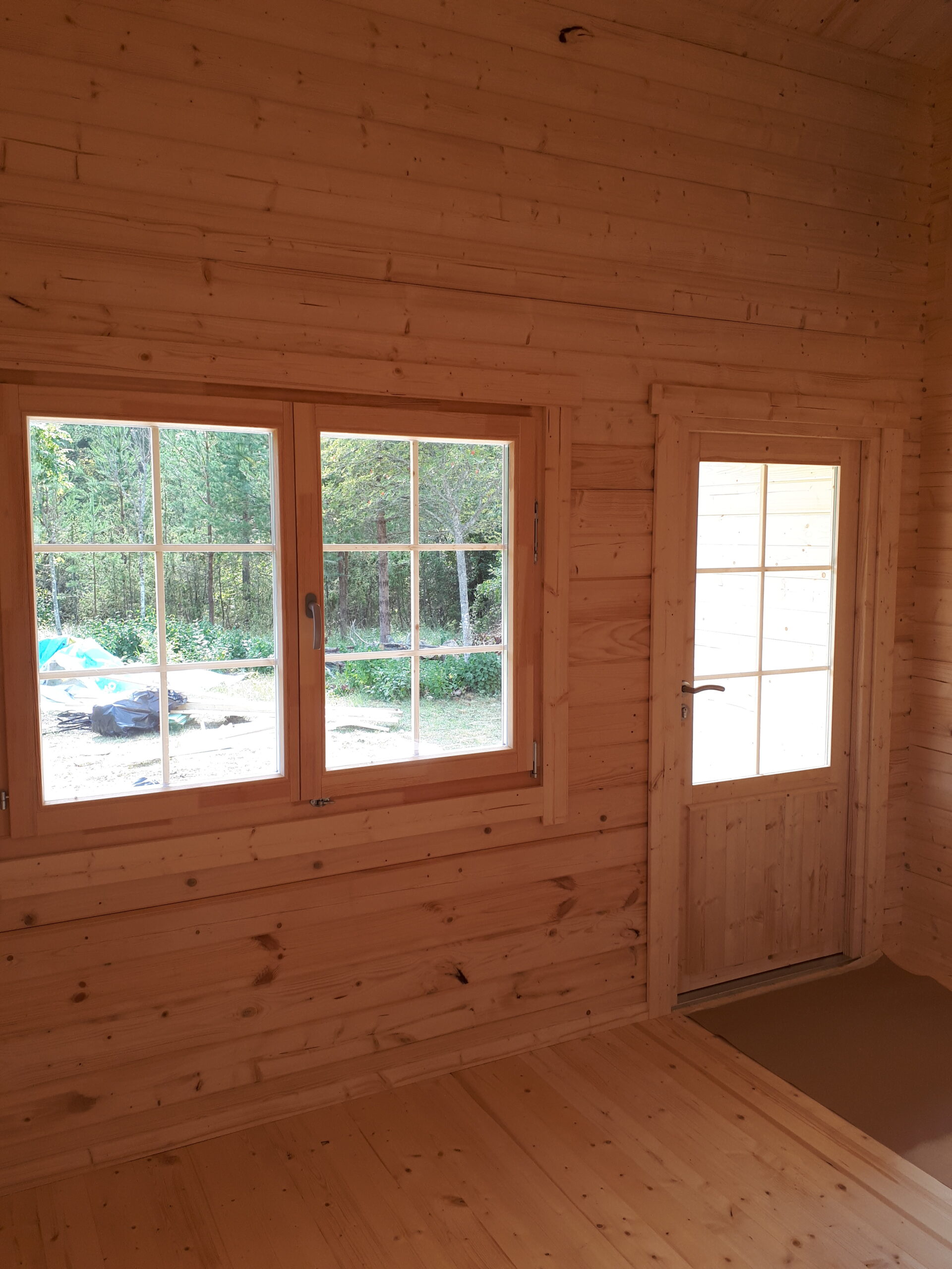 Immutatud alusraam, tapitud seinadetailid, põrandalaud, terassilaud, katuselaud, liimpudiust uksi, välisuks roostevabast plekist lävepakuga, aknad, klaaspakett, kinnitusvahendid ja paigaldusjuhend.