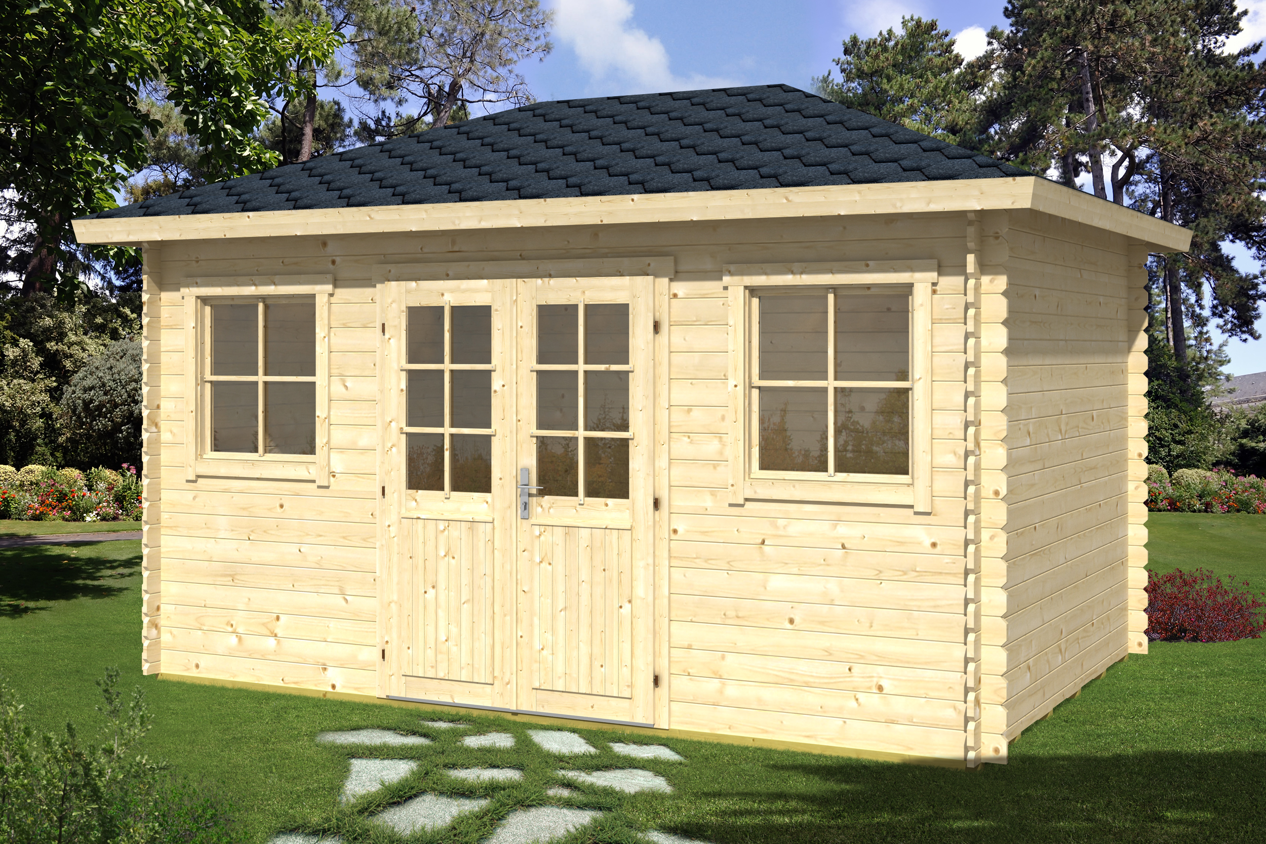Immutatud alusraam, tapitud seinadetailid, põrandalaud, katuselaud, liimpudiust uks roostevabast plekist lävepakuga, aken, klaas 3mm, kinnitusvahendid ja paigaldusjuhend.
